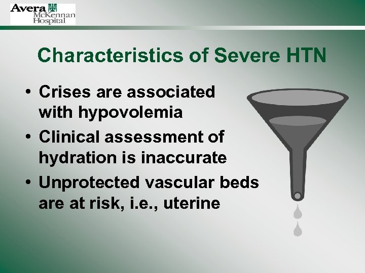 Characteristics of Severe HTN • Crises are associated with hypovolemia • Clinical assessment of hydration is inaccurate • Unprotected vascular beds are at risk, i. e. , uterine