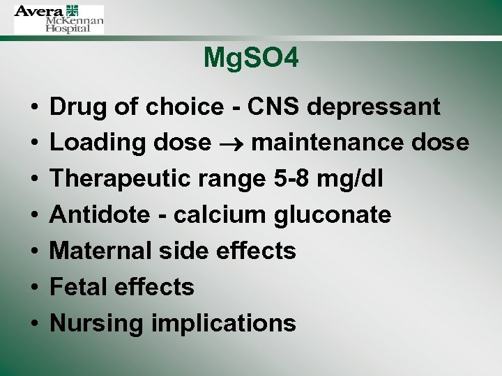 Mg. SO 4 • • Drug of choice - CNS depressant Loading dose maintenance dose Therapeutic range 5 -8 mg/dl Antidote - calcium gluconate Maternal side effects Fetal effects Nursing implications