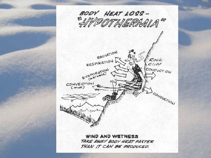 Evaporation • Responsible for 20% - 30% of heat loss in temperate conditions • Wet clothing enhances heat loss • Respiratory heat loss can be significant
