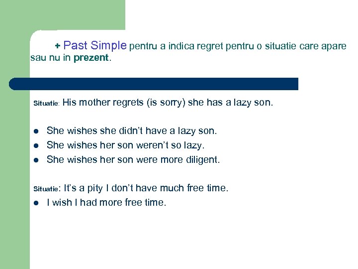 + Past Simple pentru a indica regret pentru o situatie care apare sau nu in prezent. Situatie: His l l l She wishes she didn’t have a lazy son. She wishes her son weren’t so lazy. She wishes her son were more diligent. Situatie: l mother regrets (is sorry) she has a lazy son. It’s a pity I don’t have much free time. I wish I had more free time.