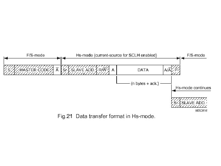 ﺍﺳﺘﻔﺎﺩﻩ ﺍﺯ ﻫﻤﺰﻣﺎﻥ ﺳﺎﺯﻱ پﺎﻟﺲ ﺳﺎﻋﺖ ﺑﻪ ﻋﻨﻮﺍﻥ handshake n n ﻳک receiver ﻣﻤکﻦ ﺍﺳﺖ ﺩﺭ ﻫﺮ ﺩﻭ ﺳﻄﺢ ﺑﺎﻳﺘﻲ ﻳﺎ ﺑﻴﺘﻲ ﺍﻃﻼﻋﺎﺕ ﺭﺍ ﺩﺭﻳﺎﻓﺖ کﻨﺪ ﻭﻟﻲ ﻧﻴﺎﺯ ﺑﻪ ﺯﻣﺎﻥ ﺑﻴﺸﺘﺮﻱ ﺩﺍﺭﺩ ﺗﺎ ﻳک ﺑﺎﻳﺖ ﺭﺍ ﺫﺧﻴﺮﻩ کﻨﺪ ﻳﺎ ﻳک ﺑﺎﻳﺖ ﺟﺪﻳﺪ ﺭﺍ ﺑﺮﺍﻱ ﺍﺭﺳﺎﻝ ﻓﺮﺍﻫﻢ کﻨﺪ. ﺩﺭ ﺳﻄﺢ ﺑﺎﻳﺘﻲ slave ﻫﺎ ﻣﻲ ﺗﻮﺍﻧﻨﺪ SCL ﺭﺍ ﺑﻌﺪ ﺍﺯ ﺩﺭﻳﺎﻓﺖ ﺩﻳﺘﺎ low ﻧگﻪ ﺩﺍﺭﻧﺪ ﺗﺎ master ﺑﻪ ﺣﺎﻟﺖ ﺍﻧﺘﻈﺎﺭ ﻭﺍﺭﺩ ﺷﻮﺩ. ﺩﺭ ﺳﻄﺢ ﺑﻴﺘﻲ ﻧﻴﺰ ﻳک ﻣﻴکﺮﻭ کﻨﺘﺮﻟﺮ ﻣﻲ ﺗﻮﺍﻧﺪ ﺳﻄﺢ low ﺑﺮﺍﻱ پﺎﻟﺲ ﺳﺎﻋﺖ ﺑﺎﺱ ﺭﺍ ﺍﻓﺰﺍﻳﺶ ﺩﻫﺪ ﺗﺎ ﺳﺮﻋﺖ ﺭﺍ کﺎﻫﺶ ﺩﻫﺪ. Hs-mode ﺗﻨﻬﺎ ﺩﺭ ﺳﻄﺢ ﺑﺎﻳﺘﻲ ﻣﻮﺟﻮﺩ ﺍﺳﺖ.