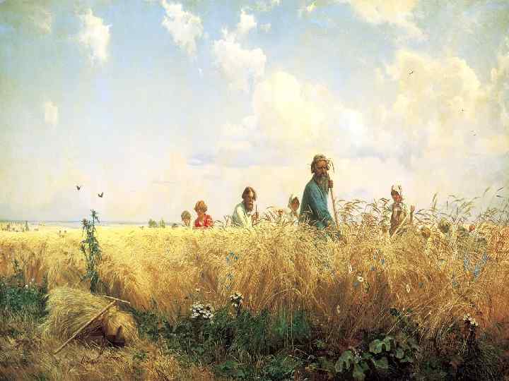 Григорий МЯСОЕДОВ Страдная пора (Косцы) n На картине Григория Мясоедова «Страдная пора» изображено пшеничное поле. Несколько человек косят урожай, скорее всего это семья. В небе много желтого цвета, вероятно, солнце уже почти в зените, косцы же встали пораньше, чтобы до наступления дневной жары закончить работу. На переднем плане вперед идет с косой отец семейства, дети играют где-то в поле, отцу помогает его сын. В осеннем, желтоватом небе то тут, то там собираются в стаи птицы, чтобы с наступлением холодов дружно улететь в теплые края. Ветерок гоняет по небу облака и нагибает к земле ростки пшеницы, будто помогая людям ее косить. Все на этой картине чем-то заняты, поглощены магией желтого пшеничного поля. Это отражено в названии картины – «Страдная пора» , пора собирать урожай. У каждого по осени свой урожай… пройдет еще немного времени и начнется совсем другая пора, зимняя. А пока есть шанс к ней подготовиться и в последний раз насладиться теплыми лучами солнца.