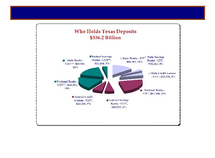In the last fiscal year, we have received only a few isolated complaints by consumers indicating possible predatory lending practices in our state-chartered banks and trust companies. One related to proper disclosure of the annual percentage rate. In addition, during the course of an on-site examination, we discovered and took action to prohibit a high cost automobile financing scheme. In the fiscal year, we have recovered $37, 803 for Texas consumers.