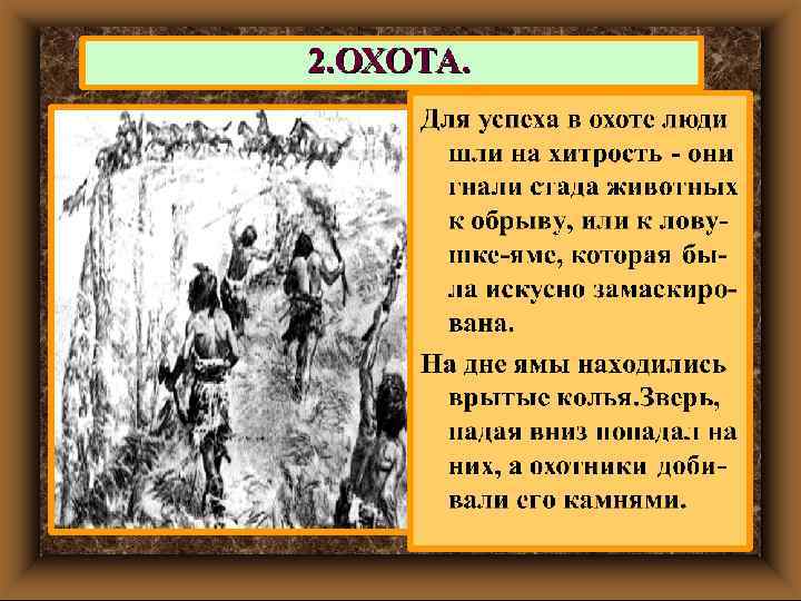 2. Занятия и орудия труда. Основными занятиями древнейших людей были собирательство и охота ( 1 ). Они загоняли крупных животных на берег реки, к обрыву или в ловушку и забивали их камнями.