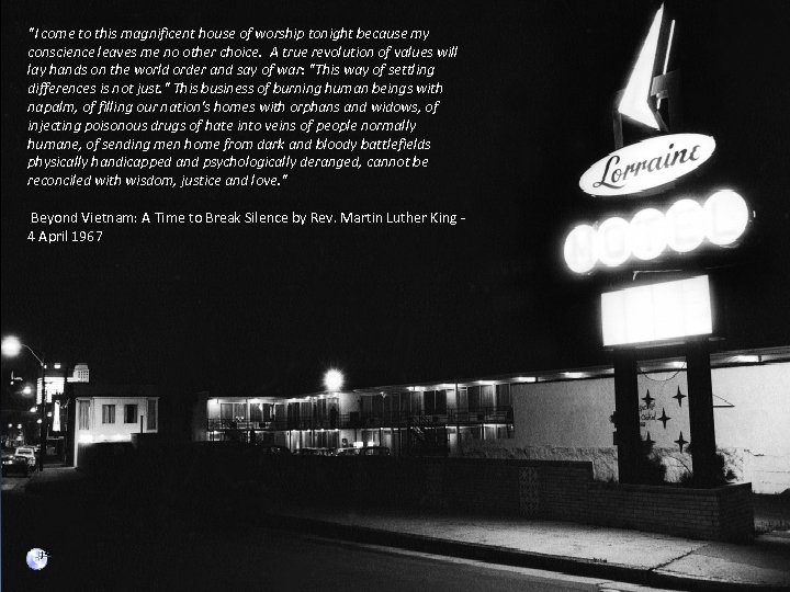 "I come to this magnificent house of worship tonight because my conscience leaves me no other choice. A true revolution of values will lay hands on the world order and say of war: "This way of settling differences is not just. " This business of burning human beings with napalm, of filling our nation's homes with orphans and widows, of injecting poisonous drugs of hate into veins of people normally humane, of sending men home from dark and bloody battlefields physically handicapped and psychologically deranged, cannot be reconciled with wisdom, justice and love. " Beyond Vietnam: A Time to Break Silence by Rev. Martin Luther King 4 April 1967