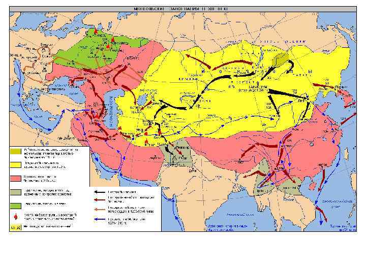 Рост монгольского государства 1211 - первое вторжение в Китай; 1218 -вторжение в Ср. Азию; (Бухара, Самарканд, Ургенч, Мерв, Хорезм, Герат); 1220 -вторжение в Иран; 1226 - разгром Тангутского гос-ва 1235 - решение о походе в Европу 1237 - покорение булгар, основание Сарая 1237 -1240 - покорение русских княжеств 1238 –вторжение в Закавказье; 1258 –падение Багдада; 1260 -1294 – правление монгольской династии в Китае; 1348 -1405 -государство Тимура (Тамерлана)