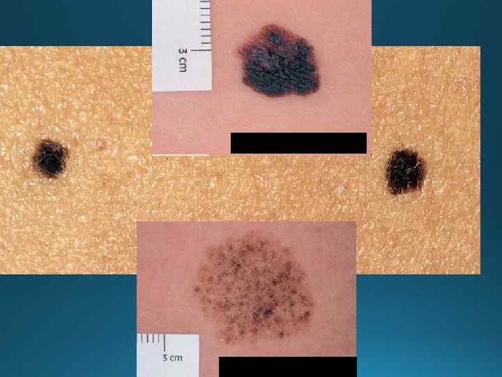 ОСНОВНЫЕ ТИПЫ МЕЛАНОЦИТАРНЫХ НЕВУСОВ (продолжение) 2. Сложный невус – выглядит как пигментированная папула, иногда с папилломатозом , до 1 см в диаметре. Невусные клетки при гистологическом исследовании располагаются как в эпидермисе, так и в дерме. 3. Внутридермальный невус – Обычно располагается на лице. Клинически это куполообразное или папилломатозное образование с выраженной ножкой, реже в форме ежевичной ягоды или в виде моллюсковидного узла на широком основании. Цвет от светлокоричневого до черного, но может быть красноватым или белесоватым. Иногда образованипе пролупрозрачное.