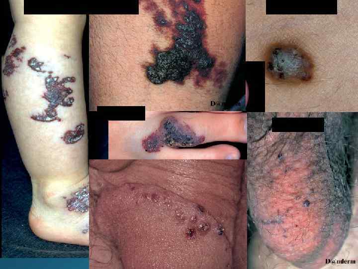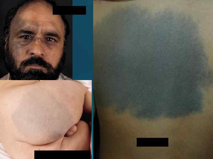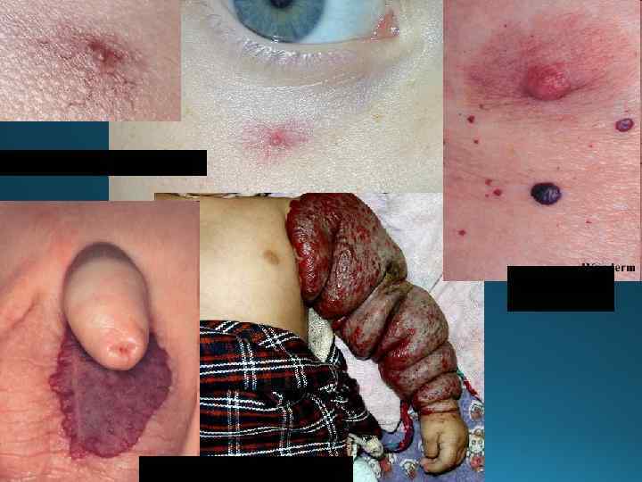КАПИЛЛЯРНЫЕ СОСУДИСТЫЕ НЕВУСЫ (продолжение) 10. Голубой пузырчатый невус – редкий синдром, при котором венозные мальформации кожи сочетаются с таковыми слизистых оболочек, внутренних органов. Элементы представлены синюшнобагровыми узелками, по консистенции напоминающими резину. Морщинистая поверхность придает сходство с соском. Диаметр - до нескольких сантиметров. Характерна спонтанная болезненность особенно по ночам. Аналогичные венозные мальформации могут быть в желудочно-кишечном тракте, на языке, под языком, в носоглотке, легких, сердце, мозге, его оболочках.