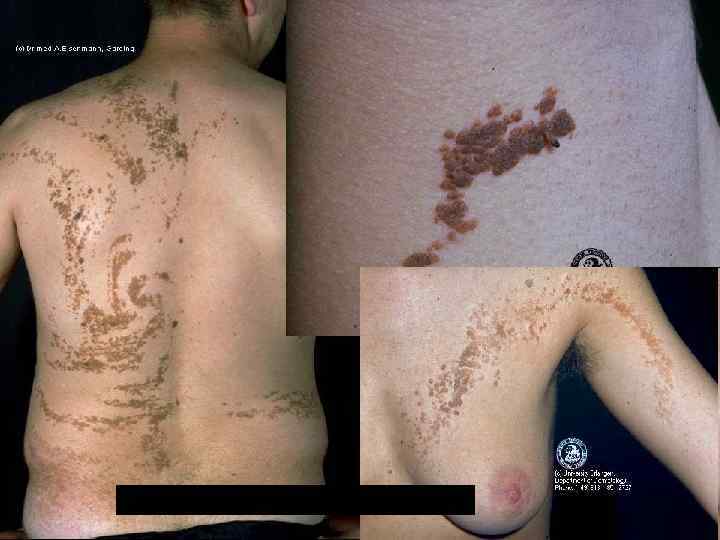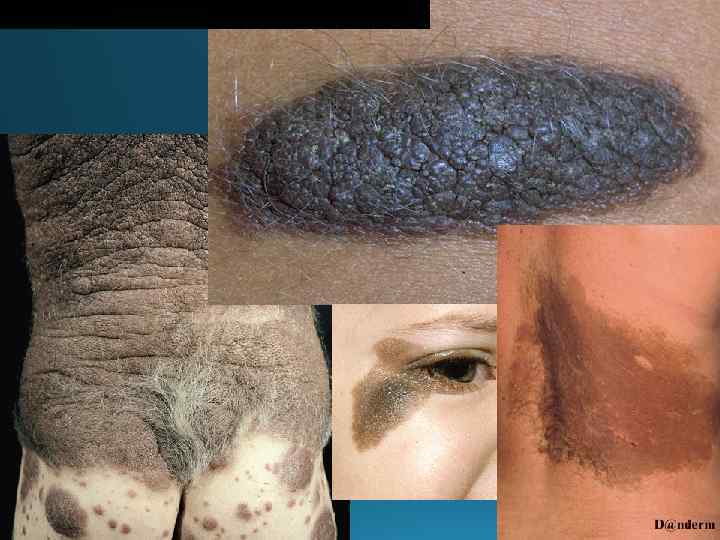 МЕЛАНОЦИТАРНЫЕ НЕВУСЫ ДЕРМАЛЬНОГО ПРОИСХОЖДЕНИЯ. А. Монгольское – пятно рождения присутствует80% с детей у негроидной и монголоидной рас, тогда как у европейцев – не более чем у 1%. Это хорошо отграниченное округлое или овальное пятно в пояснично-крестцовой области, имеющее равномерную тусклую серовато-синюшную или коричневую окраску. Диаметр может достигать 5 -10 см. Может исчезнуть к 13 годам. Б. Невус Оты – не исчезающая с возрастом пигментация склер и кожи вокруг глаза, обусловленная скоплением меланоцитов в дерме, в зоне иннервации тройничного нерва. Иногда сопровождается пятнистым поражением конъюнктивы. В. Невус Ито – локализуется в надключичной области, на боковых поверхностях шеи, в области лопатки и дельтовидных мышц.