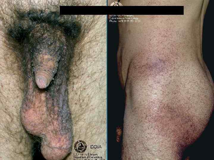 АНГИОКЕРАТОМЫ (продолжение) 5. Диффузная ангиокератома туловища Фабри – наследственный липоидоз, в основе которого лежит отсутствие или снижение активности фермента церамидтригексозидазы, что ведет к накоплению в тканях липида – церамидтригексозида. Наследуется Х -рецессивно сцепленно с половой хромосомой. Болеют мальчики или юноши, болезнь прогрессирует с исходом в почечную или сердечную недостаточность. Клинически характеризуется возникновением на коже и слизистых оболочках множественных кератинизированных сосудистых узелков величиной с булавочную головку темнокрасного цвета, локализующихся на губах, щеках, в подмышечных ямках, пупочной области, на мошонке, пальцах. Гистологически находят расширение капилляров, имеющих вид внутридермальных кровяных кист. Наблюдаются ампулоподобные расширения конъюнктивальных вен, участки помутнения роговицы, изменения глазного дна.