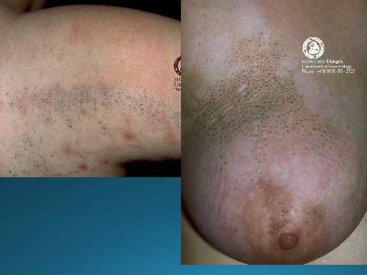 ЭПИДЕРМАЛЬНЫЕ НЕВУСЫ (продолжение): 6. Дермальный эпидермальный невус – проявляется зудящими линейными элементами, состоящими из псориазиформных папул, располагающимися обычно на протяжении от ягодиц до стоп на нижних конечностях. Может быть спонтанная инволюция, но обычно резистентен к терапии. Характерна специфическая гистологическая картина: столбики гипергранулеза с ортокератотическим гиперкератозом чередуются со столбиками гранулеза и паракератотического гиперкератоза. В сосочковом слое дермы – лимфоцитарный инфильтрат. Иногда присутствует спонгиоз (сходство с псориазиформной экземой). Возникает в течение первых 5 лет жизни.