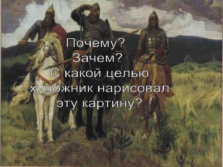 План: I) Творчество художника В. М. Васнецова II)Описание содержания картины «Богатыри» v. Общее впечатление v. Илья Муромец v. Добрыня Никитич v. Алёша Попович v. Природа III)Что художник хотел передать этой картиной?