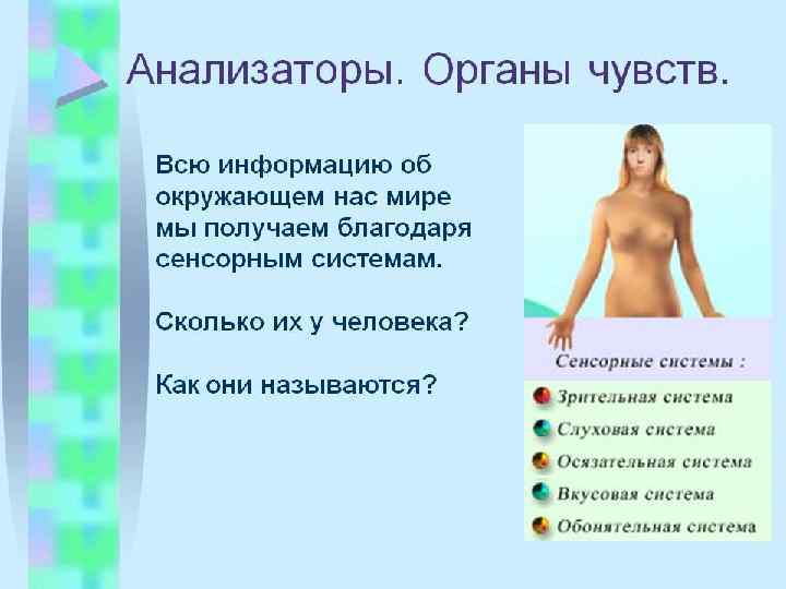 Человек воспринимает окружающий мир при помощи специализированных сенсорных систем — анализаторов. Восприятие — это процесс и результат формирования субъективного образа предмета или явления, действующего на анализатор. Классификация анализаторов осуществляется на основе местоположения рецепторов.