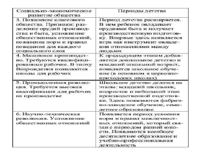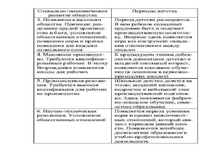 Историей детства занимались разные ученые, н о особенно известен выдающийся специалист в области детской и педагогической психологии Д. Б. Эльконин связал периоды детского развития с периодизацией развития общества (табл. 1)