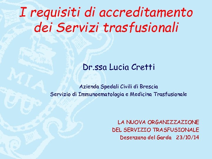 I requisiti di accreditamento dei Servizi trasfusionali Dr. ssa Lucia Cretti Azienda Spedali Civili di Brescia Servizio di Immunoematologia e Medicina Trasfusionale LA NUOVA ORGANIZZAZIONE DEL SERVIZIO TRASFUSIONALE Desenzano del Garda 23/10/14