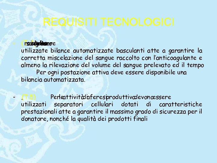 REQUISITI TECNOLOGICI - (T. 4 del. Per raccolta sangue intero devono ) essere la utilizzate bilance automatizzate basculanti atte a garantire la corretta miscelazione del sangue raccolto con l’anticoagulante e almeno la rilevazione del volume del sangue prelevato ed il tempo Per ogni postazione attiva deve essere disponibile una bilancia automatizzata. - , (T. 5) Perleattivitàdiaferesiproduttivadevonoessere utilizzati separatori cellulari dotati di caratteristiche prestazionali atte a garantire il massimo grado di sicurezza per il donatore, nonché la qualità dei prodotti finali
