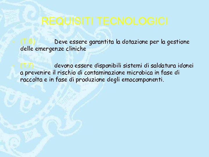 REQUISITI TECNOLOGICI - (T. 6) Deve essere garantita la dotazione per la gestione delle emergenze cliniche - (T. 7) devono essere disponibili sistemi di saldatura idonei a prevenire il rischio di contaminazione microbica in fase di raccolta e in fase di produzione degli emocomponenti.