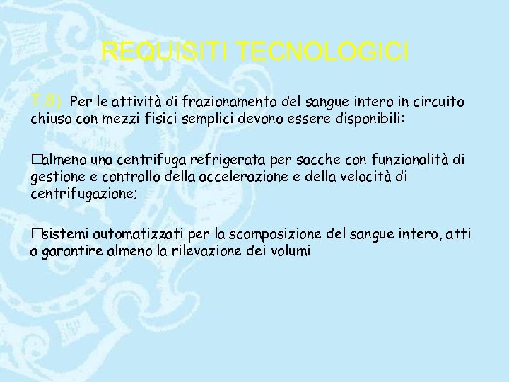 REQUISITI TECNOLOGICI T. 8) Per le attività di frazionamento del sangue intero in circuito chiuso con mezzi fisici semplici devono essere disponibili: almeno una centrifuga refrigerata per sacche con funzionalità di gestione e controllo della accelerazione e della velocità di centrifugazione; sistemi automatizzati per la scomposizione del sangue intero, atti a garantire almeno la rilevazione dei volumi