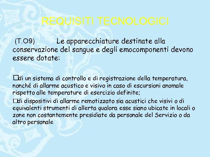 REQUISITI TECNOLOGICI (T. O 9) Le apparecchiature destinate alla conservazione del sangue e degli emocomponenti devono essere dotate: un sistema di controllo e di registrazione della temperatura, di nonché di allarme acustico e visivo in caso di escursioni anomale rispetto alle temperature di esercizio definite; dispositivi di allarme remotizzato sia acustici che visivi o di di equivalenti strumenti di allerta qualora esse siano ubicate in locali o zone non costantemente presidiate da personale del Servizio o da altro personale