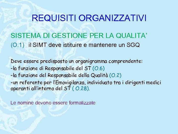 REQUISITI ORGANIZZATIVI SISTEMA DI GESTIONE PER LA QUALITA’ (O. 1) il SIMT deve istituire e mantenere un SGQ Deve essere predisposto un organigramma comprendente: -la funzione di Responsabile del ST (O. 6) -la funzione del Responsabile della Qualità (O. 2) -un referente per l’Emovigilanza, individuato tra i dirigenti medici operanti all’interno del ST ( O. 28). Le nomine devono essere formalizzate