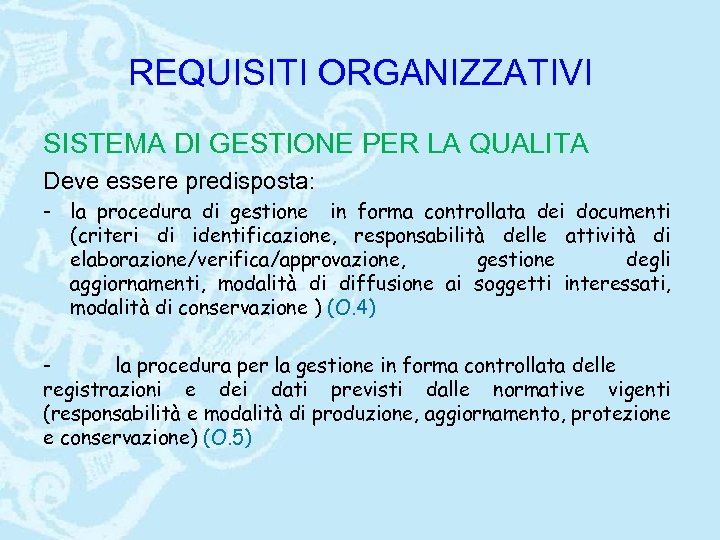REQUISITI ORGANIZZATIVI SISTEMA DI GESTIONE PER LA QUALITA Deve essere predisposta: - la procedura di gestione in forma controllata dei documenti (criteri di identificazione, responsabilità delle attività di elaborazione/verifica/approvazione, gestione degli aggiornamenti, modalità di diffusione ai soggetti interessati, modalità di conservazione ) (O. 4) la procedura per la gestione in forma controllata delle registrazioni e dei dati previsti dalle normative vigenti (responsabilità e modalità di produzione, aggiornamento, protezione e conservazione) (O. 5)