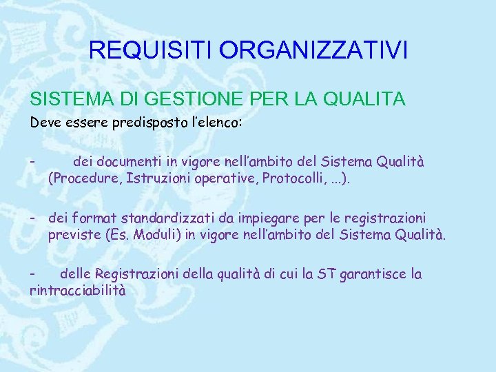 REQUISITI ORGANIZZATIVI SISTEMA DI GESTIONE PER LA QUALITA Deve essere predisposto l’elenco: - dei documenti in vigore nell’ambito del Sistema Qualità (Procedure, Istruzioni operative, Protocolli, . . . ). - dei format standardizzati da impiegare per le registrazioni previste (Es. Moduli) in vigore nell’ambito del Sistema Qualità. delle Registrazioni della qualità di cui la ST garantisce la rintracciabilità