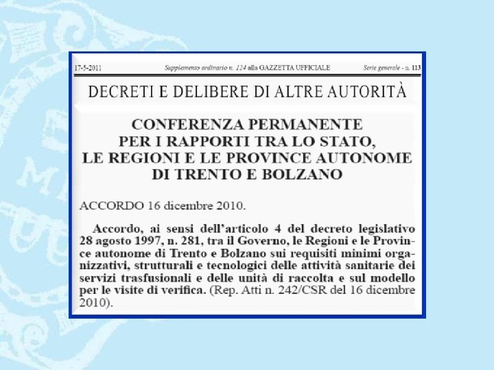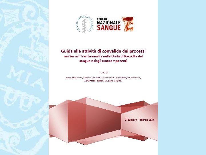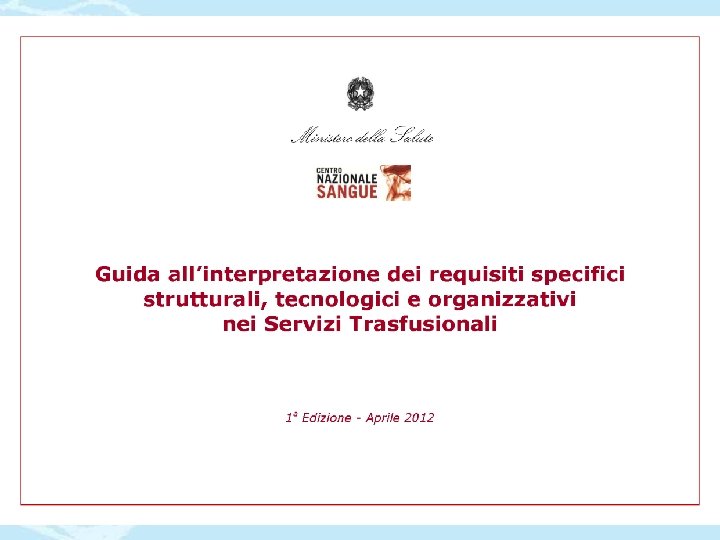 REQUISITI ORGANIZZATIVI Gestione delle tecnologie (O. 11 ) devono essere predisposti: • la Procedure per la gestione controllata delle apparecchiature • I Piani formalizzati per le attività di manutenzione, pulizia e sanificazione delle apparecchiature (es cosa fare dopo rottura sacca in centrifuga) • Le Registrazioni inerenti agli interventi di manutenzione ordinaria e straordinaria effettuati. • Le Procedure per la gestione controllata delle apparecchiature impiegate per la conservazione del sangue, degli emocomponenti
