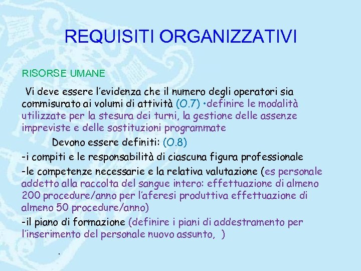 REQUISITI ORGANIZZATIVI RISORSE UMANE Vi deve essere l’evidenza che il numero degli operatori sia commisurato ai volumi di attività (O. 7) • definire le modalità utilizzate per la stesura dei turni, la gestione delle assenze impreviste e delle sostituzioni programmate Devono essere definiti: (O. 8) -i compiti e le responsabilità di ciascuna figura professionale -le competenze necessarie e la relativa valutazione (es personale addetto alla raccolta del sangue intero: effettuazione di almeno 200 procedure/anno per l’aferesi produttiva effettuazione di almeno 50 procedure/anno) -il piano di formazione (definire i piani di addestramento per l’inserimento del personale nuovo assunto, ) .