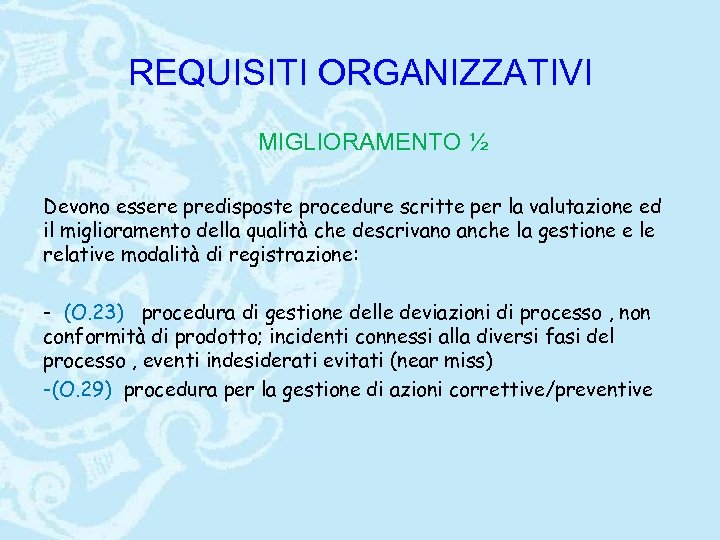 REQUISITI ORGANIZZATIVI MIGLIORAMENTO ½ Devono essere predisposte procedure scritte per la valutazione ed il miglioramento della qualità che descrivano anche la gestione e le relative modalità di registrazione: - (O. 23) procedura di gestione delle deviazioni di processo , non conformità di prodotto; incidenti connessi alla diversi fasi del processo , eventi indesiderati evitati (near miss) -(O. 29) procedura per la gestione di azioni correttive/preventive