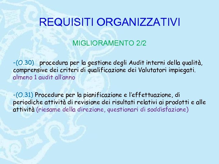 REQUISITI ORGANIZZATIVI MIGLIORAMENTO 2/2 -(O. 30) procedura per la gestione degli Audit interni della qualità, comprensive dei criteri di qualificazione dei Valutatori impiegati. almeno 1 audit all’anno -(O. 31) Procedure per la pianificazione e l’effettuazione, di periodiche attività di revisione dei risultati relativi ai prodotti e alle attività (riesame della direzione, questionari di soddisfazione)
