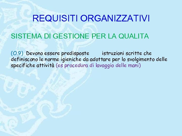REQUISITI ORGANIZZATIVI SISTEMA DI GESTIONE PER LA QUALITA (O. 9) Devono essere predisposte istruzioni scritte che definiscono le norme igieniche da adottare per lo svolgimento delle specifiche attività (es procedura di lavaggio delle mani)