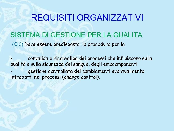 REQUISITI ORGANIZZATIVI SISTEMA DI GESTIONE PER LA QUALITA (O. 3) Deve essere predisposta la procedura per la convalida e riconvalida dei processi che influiscono sulla qualità e sulla sicurezza del sangue, degli emocomponenti gestione controllata dei cambiamenti eventualmente introdotti nei processi (change control).