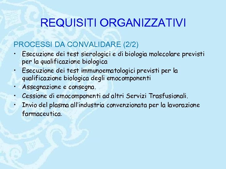 REQUISITI ORGANIZZATIVI PROCESSI DA CONVALIDARE (2/2) • Esecuzione dei test sierologici e di biologia molecolare previsti per la qualificazione biologica • Esecuzione dei test immunoematologici previsti per la qualificazione biologica degli emocomponenti • Assegnazione e consegna. • Cessione di emocomponenti ad altri Servizi Trasfusionali. • Invio del plasma all’industria convenzionata per la lavorazione farmaceutica.