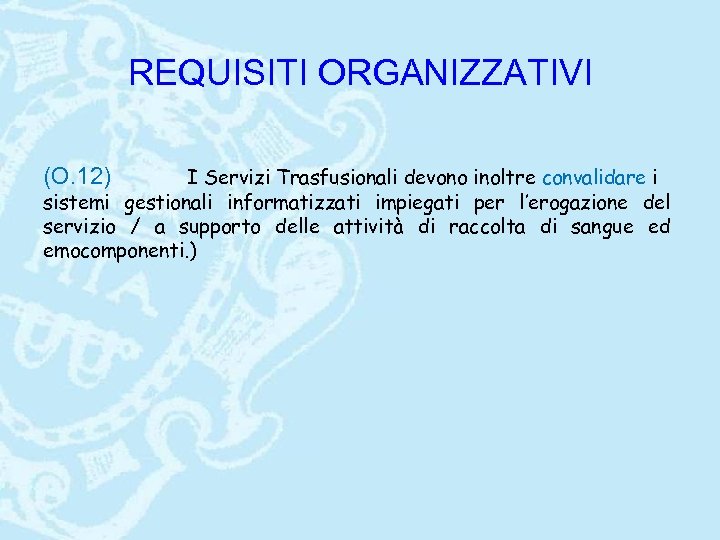 REQUISITI ORGANIZZATIVI I Servizi Trasfusionali devono inoltre convalidare i sistemi gestionali informatizzati impiegati per l’erogazione del servizio / a supporto delle attività di raccolta di sangue ed emocomponenti. ) (O. 12)