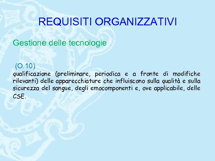REQUISITI ORGANIZZATIVI Gestione delle tecnologie (O. 10) qualificazione (preliminare, periodica e a fronte di modifiche rilevanti) delle apparecchiature che influiscono sulla qualità e sulla sicurezza del sangue, degli emocomponenti e, ove applicabile, delle CSE.