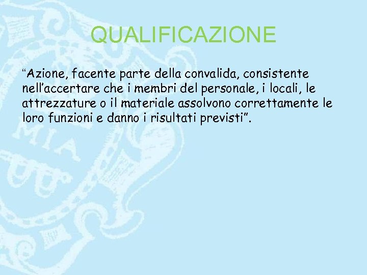 QUALIFICAZIONE “Azione, facente parte della convalida, consistente nell’accertare che i membri del personale, i locali, le attrezzature o il materiale assolvono correttamente le loro funzioni e danno i risultati previsti”.