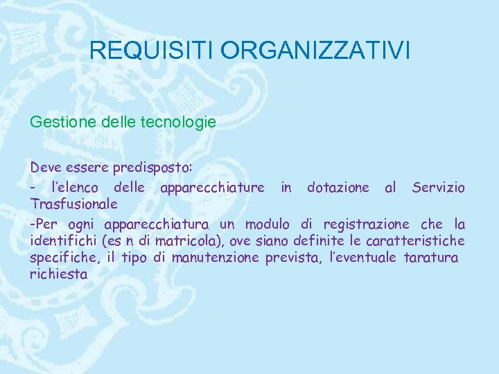 REQUISITI ORGANIZZATIVI Gestione delle tecnologie Deve essere predisposto: - l’elenco delle apparecchiature in dotazione al Servizio Trasfusionale -Per ogni apparecchiatura un modulo di registrazione che la identifichi (es n di matricola), ove siano definite le caratteristiche specifiche, il tipo di manutenzione prevista, l’eventuale taratura richiesta