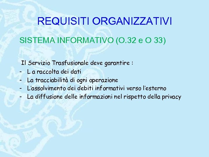 REQUISITI ORGANIZZATIVI SISTEMA INFORMATIVO (O. 32 e O 33) Il Servizio Trasfusionale deve garantire : - L a raccolta dei dati - La tracciabilità di ogni operazione - L’assolvimento dei debiti informativi verso l’esterno - La diffusione delle informazioni nel rispetto della privacy