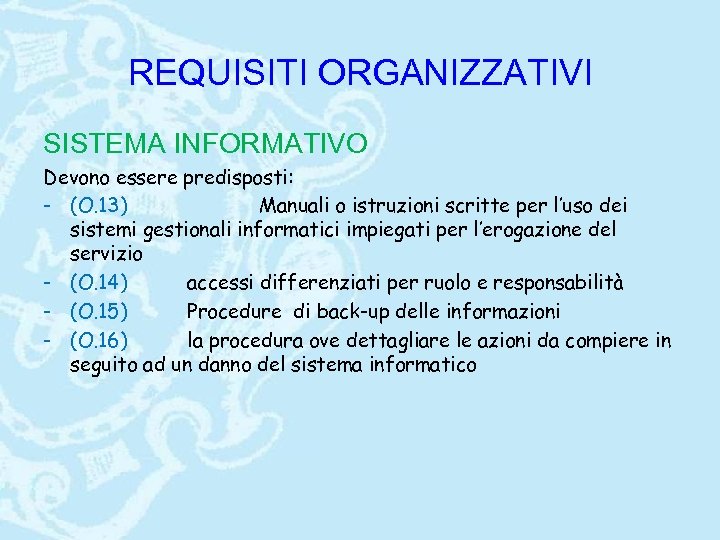 REQUISITI ORGANIZZATIVI SISTEMA INFORMATIVO Devono essere predisposti: - (O. 13) Manuali o istruzioni scritte per l’uso dei sistemi gestionali informatici impiegati per l’erogazione del servizio - (O. 14) accessi differenziati per ruolo e responsabilità - (O. 15) Procedure di back-up delle informazioni - (O. 16) la procedura ove dettagliare le azioni da compiere in seguito ad un danno del sistema informatico