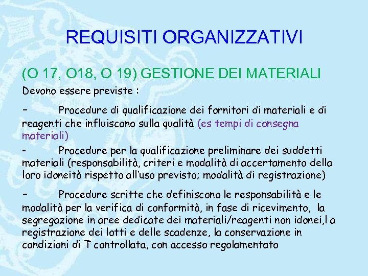 REQUISITI ORGANIZZATIVI (O 17, O 18, O 19) GESTIONE DEI MATERIALI Devono essere previste : - Procedure di qualificazione dei fornitori di materiali e di reagenti che influiscono sulla qualità (es tempi di consegna materiali) Procedure per la qualificazione preliminare dei suddetti materiali (responsabilità, criteri e modalità di accertamento della loro idoneità rispetto all’uso previsto; modalità di registrazione) - Procedure scritte che definiscono le responsabilità e le modalità per la verifica di conformità, in fase di ricevimento, la segregazione in aree dedicate dei materiali/reagenti non idonei, l a registrazione dei lotti e delle scadenze, la conservazione in condizioni di T controllata, con accesso regolamentato