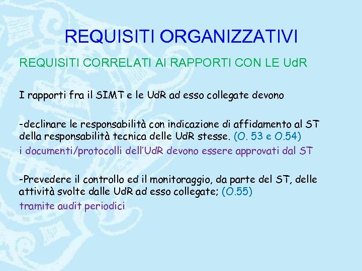 REQUISITI ORGANIZZATIVI REQUISITI CORRELATI AI RAPPORTI CON LE Ud. R I rapporti fra il SIMT e le Ud. R ad esso collegate devono -declinare le responsabilità con indicazione di affidamento al ST della responsabilità tecnica delle Ud. R stesse. (O. 53 e O. 54) i documenti/protocolli dell’Ud. R devono essere approvati dal ST -Prevedere il controllo ed il monitoraggio, da parte del ST, delle attività svolte dalle Ud. R ad esso collegate; (O. 55) tramite audit periodici