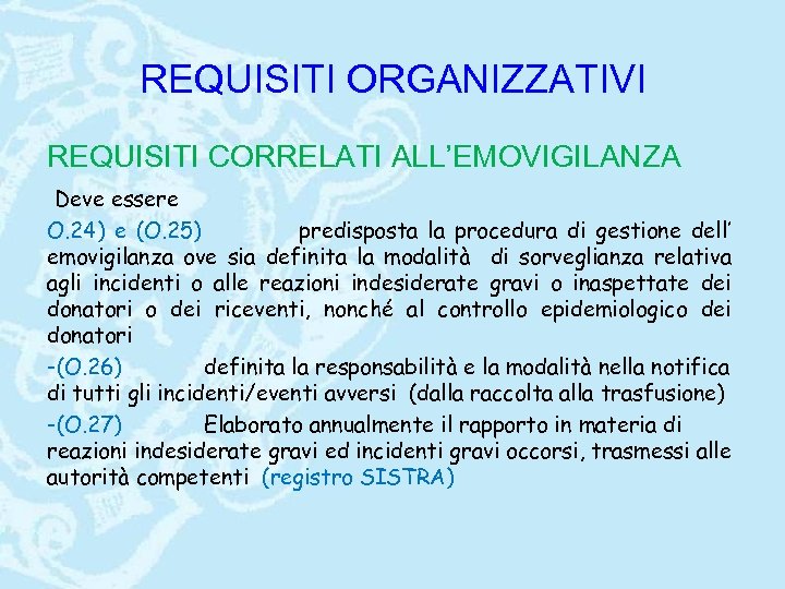 REQUISITI ORGANIZZATIVI REQUISITI CORRELATI ALL’EMOVIGILANZA Deve essere O. 24) e (O. 25) predisposta la procedura di gestione dell’ emovigilanza ove sia definita la modalità di sorveglianza relativa agli incidenti o alle reazioni indesiderate gravi o inaspettate dei donatori o dei riceventi, nonché al controllo epidemiologico dei donatori -(O. 26) definita la responsabilità e la modalità nella notifica di tutti gli incidenti/eventi avversi (dalla raccolta alla trasfusione) -(O. 27) Elaborato annualmente il rapporto in materia di reazioni indesiderate gravi ed incidenti gravi occorsi, trasmessi alle autorità competenti (registro SISTRA)