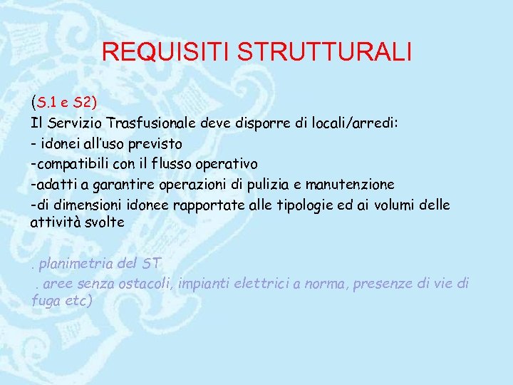 REQUISITI STRUTTURALI (S. 1 e S 2) Il Servizio Trasfusionale deve disporre di locali/arredi: - idonei all’uso previsto -compatibili con il flusso operativo -adatti a garantire operazioni di pulizia e manutenzione -di dimensioni idonee rapportate alle tipologie ed ai volumi delle attività svolte. planimetria del ST. aree senza ostacoli, impianti elettrici a norma, presenze di vie di fuga etc)