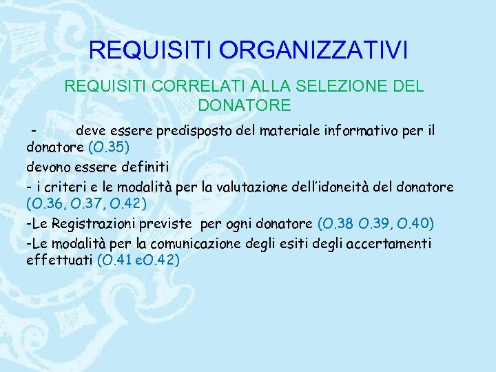 REQUISITI ORGANIZZATIVI REQUISITI CORRELATI ALLA SELEZIONE DEL DONATORE deve essere predisposto del materiale informativo per il donatore (O. 35) devono essere definiti - i criteri e le modalità per la valutazione dell’idoneità del donatore (O. 36, O. 37, O. 42) -Le Registrazioni previste per ogni donatore (O. 38 O. 39, O. 40) -Le modalità per la comunicazione degli esiti degli accertamenti effettuati (O. 41 e. O. 42) -