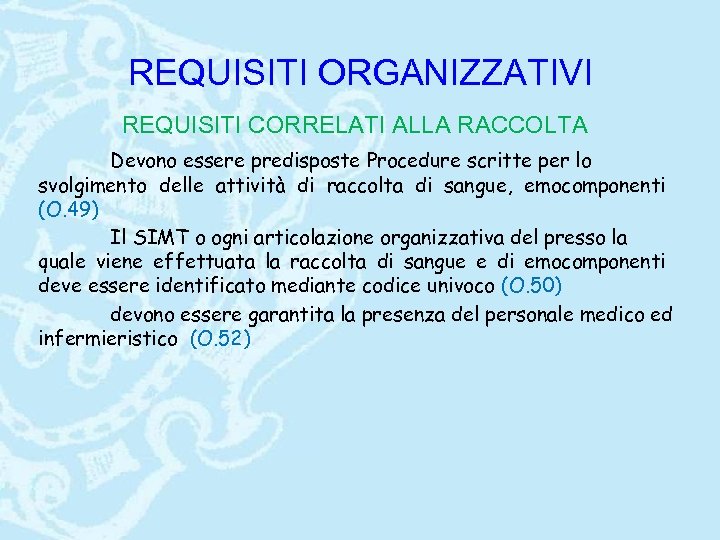 REQUISITI ORGANIZZATIVI REQUISITI CORRELATI ALLA RACCOLTA Devono essere predisposte Procedure scritte per lo svolgimento delle attività di raccolta di sangue, emocomponenti (O. 49) Il SIMT o ogni articolazione organizzativa del presso la quale viene effettuata la raccolta di sangue e di emocomponenti deve essere identificato mediante codice univoco (O. 50) devono essere garantita la presenza del personale medico ed infermieristico (O. 52)