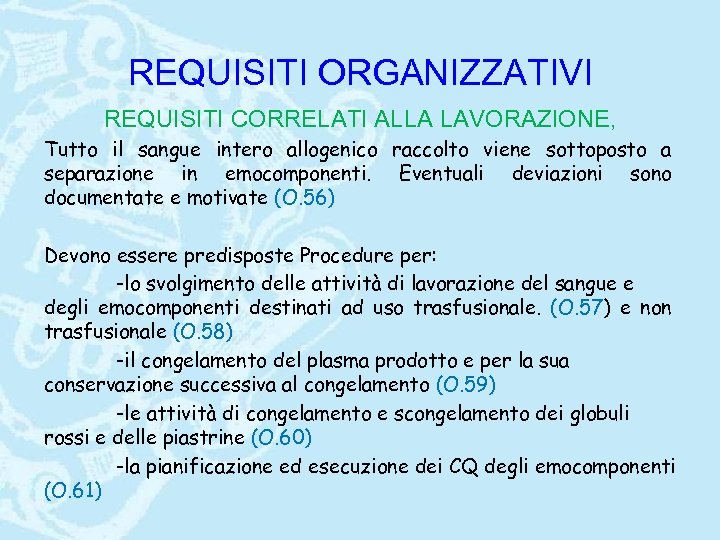 REQUISITI ORGANIZZATIVI REQUISITI CORRELATI ALLA LAVORAZIONE, Tutto il sangue intero allogenico raccolto viene sottoposto a separazione in emocomponenti. Eventuali deviazioni sono documentate e motivate (O. 56) Devono essere predisposte Procedure per: -lo svolgimento delle attività di lavorazione del sangue e degli emocomponenti destinati ad uso trasfusionale. (O. 57) e non trasfusionale (O. 58) -il congelamento del plasma prodotto e per la sua conservazione successiva al congelamento (O. 59) -le attività di congelamento e scongelamento dei globuli rossi e delle piastrine (O. 60) -la pianificazione ed esecuzione dei CQ degli emocomponenti (O. 61)