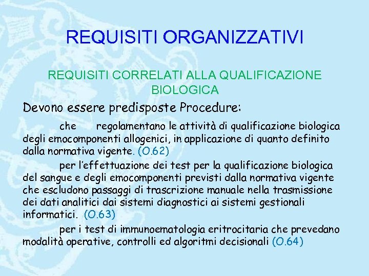 REQUISITI ORGANIZZATIVI REQUISITI CORRELATI ALLA QUALIFICAZIONE BIOLOGICA Devono essere predisposte Procedure: che regolamentano le attività di qualificazione biologica degli emocomponenti allogenici, in applicazione di quanto definito dalla normativa vigente. (O. 62) per l’effettuazione dei test per la qualificazione biologica del sangue e degli emocomponenti previsti dalla normativa vigente che escludono passaggi di trascrizione manuale nella trasmissione dei dati analitici dai sistemi diagnostici ai sistemi gestionali informatici. (O. 63) per i test di immunoematologia eritrocitaria che prevedano modalità operative, controlli ed algoritmi decisionali (O. 64)