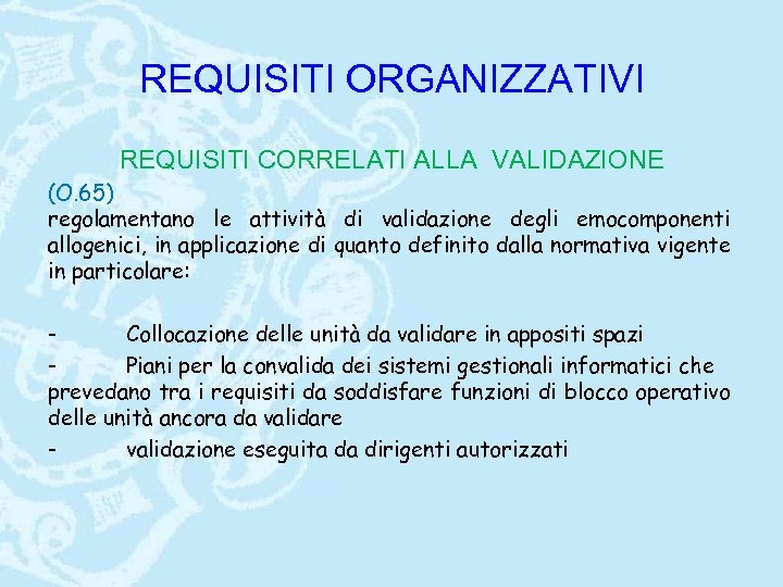 REQUISITI ORGANIZZATIVI REQUISITI CORRELATI ALLA VALIDAZIONE (O. 65) regolamentano le attività di validazione degli emocomponenti allogenici, in applicazione di quanto definito dalla normativa vigente in particolare: Collocazione delle unità da validare in appositi spazi Piani per la convalida dei sistemi gestionali informatici che prevedano tra i requisiti da soddisfare funzioni di blocco operativo delle unità ancora da validare validazione eseguita da dirigenti autorizzati