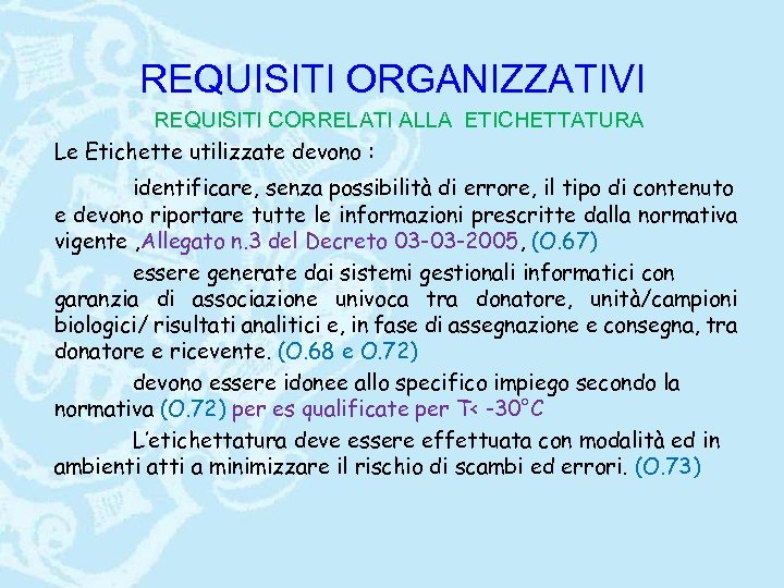 REQUISITI ORGANIZZATIVI REQUISITI CORRELATI ALLA ETICHETTATURA Le Etichette utilizzate devono : identificare, senza possibilità di errore, il tipo di contenuto e devono riportare tutte le informazioni prescritte dalla normativa vigente , Allegato n. 3 del Decreto 03 -03 -2005, (O. 67) essere generate dai sistemi gestionali informatici con garanzia di associazione univoca tra donatore, unità/campioni biologici/ risultati analitici e, in fase di assegnazione e consegna, tra donatore e ricevente. (O. 68 e O. 72) devono essere idonee allo specifico impiego secondo la normativa (O. 72) per es qualificate per T< -30°C L’etichettatura deve essere effettuata con modalità ed in ambienti atti a minimizzare il rischio di scambi ed errori. (O. 73)