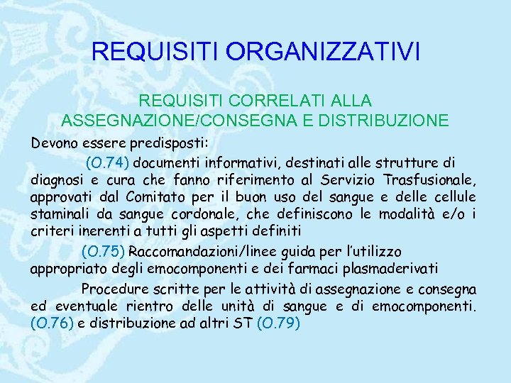 REQUISITI ORGANIZZATIVI REQUISITI CORRELATI ALLA ASSEGNAZIONE/CONSEGNA E DISTRIBUZIONE Devono essere predisposti: (O. 74) documenti informativi, destinati alle strutture di diagnosi e cura che fanno riferimento al Servizio Trasfusionale, approvati dal Comitato per il buon uso del sangue e delle cellule staminali da sangue cordonale, che definiscono le modalità e/o i criteri inerenti a tutti gli aspetti definiti (O. 75) Raccomandazioni/linee guida per l’utilizzo appropriato degli emocomponenti e dei farmaci plasmaderivati Procedure scritte per le attività di assegnazione e consegna ed eventuale rientro delle unità di sangue e di emocomponenti. (O. 76) e distribuzione ad altri ST (O. 79)